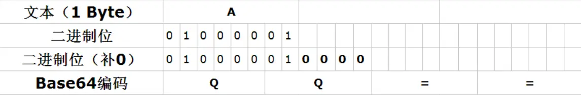 比如a这个字母,ASCII码是65,转换成二进制是01000001,转换成六个一组010000 | 01,就会发现后面不足以组成六位数,就可以在后面添零,就变成了👉010000 | 010000,转换成十进制就是16,然后根据BASE64码表对应的是Q,那么a的加密后就是QQ,但是我自己的理解是,加密后的长度也就是编码后的长度必须能整除4,才可以,这里QQ不能整除4所以不行,就可以加上=,长度就可以了,所以最终的编码就是QQ==。