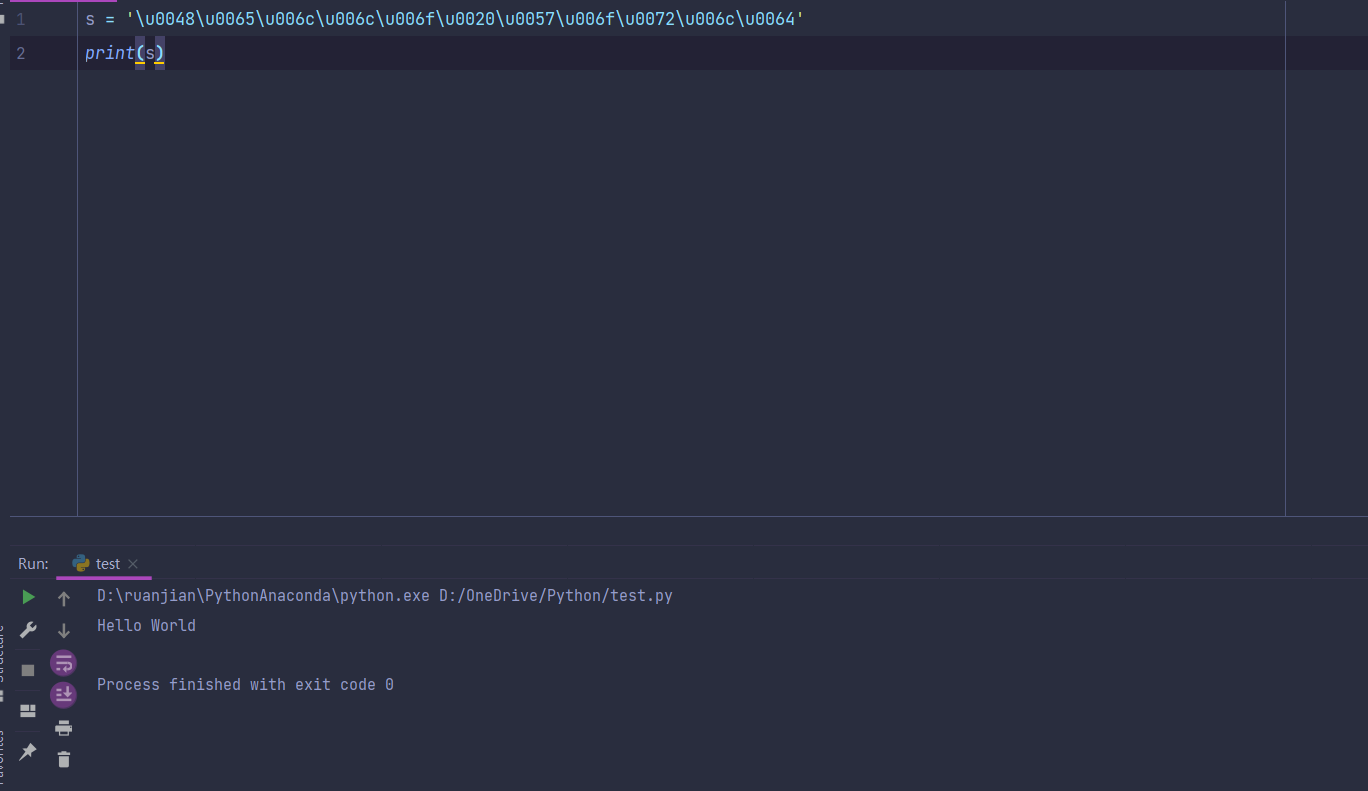 特征是以\u数字或者字母加数字,比如,\u6211,转换中文就是“我”,\u过后是每四个为一组,最简单解码方式可以使用python的print函数输出即可,编码👉**\u0048\u0065\u006c\u006c\u006f\u0020\u0057\u006f\u0072\u006c\u0064**,解码效果如下图👇,成功解码出字符串Hello World