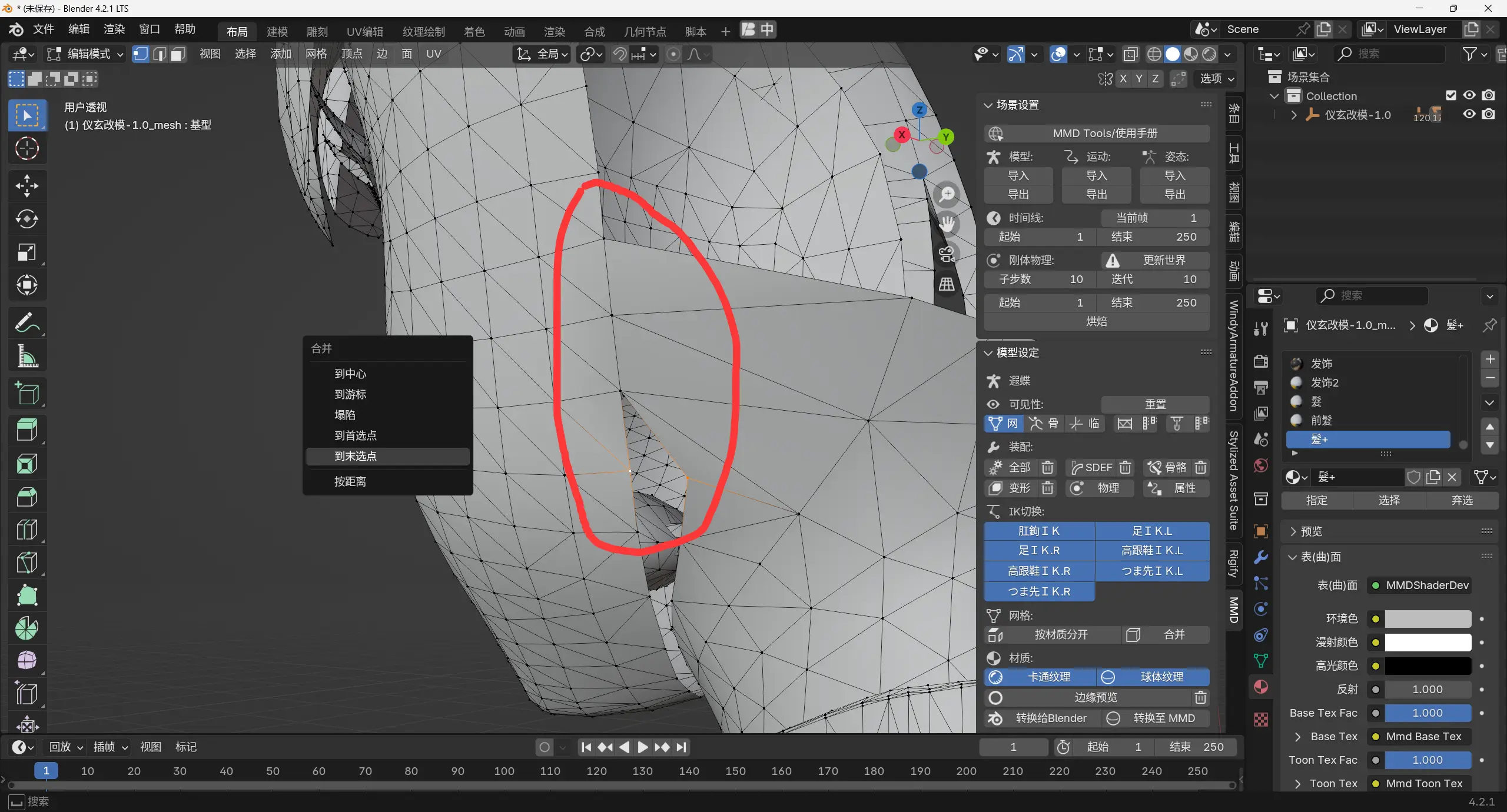 先按照第步的操作选择body材质,但是不要隐藏而是按下M然后出现合并选项,按距离合并,这样可以合并一下重叠点,和非常近的点,脸部也是一样的操作,但是头发就不要做这个操作了,我之前试了做这样的操作会导致头发显示不正常。